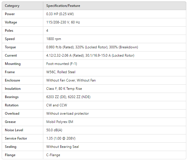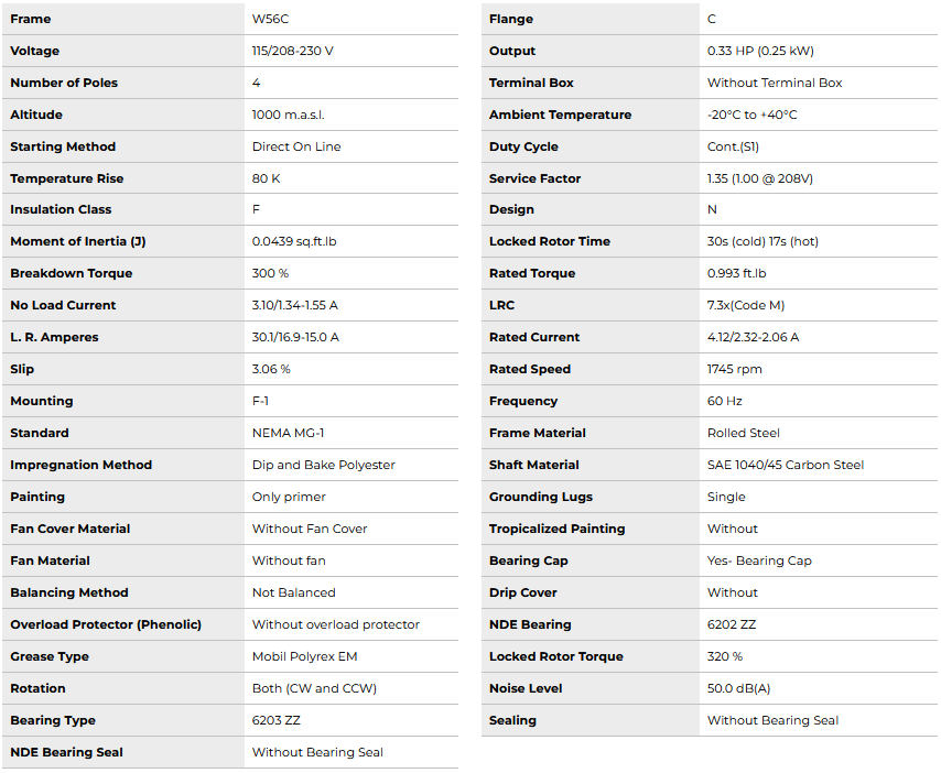 Torque 0.993 ft.lb (Rated), 320% (Locked Rotor), 300% (Breakdown)