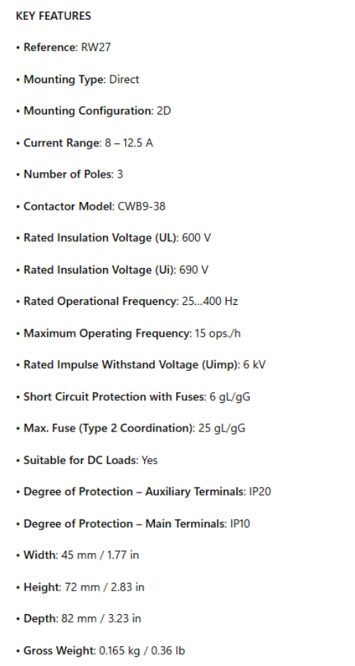 RW27-2D3-D125, Overload Relay, 3/p, 8-12.5A, ONLY USED FOR CWB est en rupture de stock et sera expédié dès qu’il sera de retour en stock.