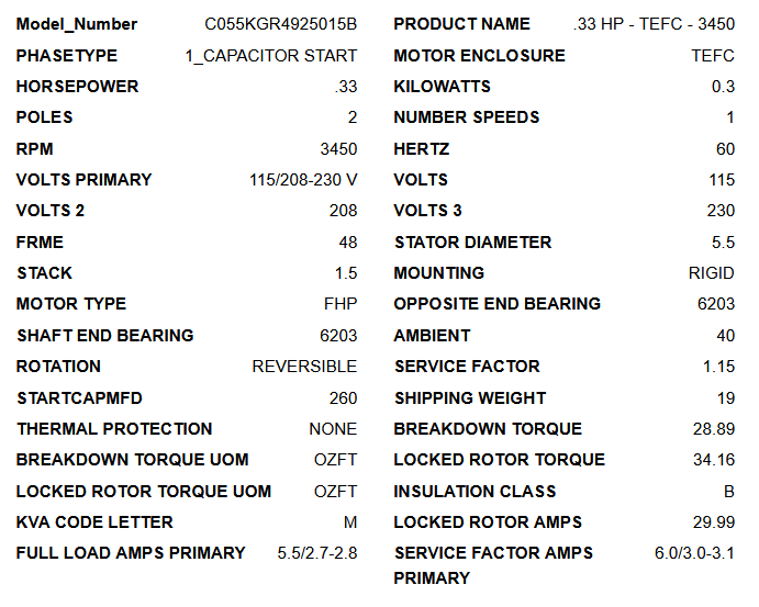 T13C1J4, General Purpose, 1/3Hp, 3450 RPM, 115/208-230V, 1PH, 60Hz, TEFC, Fr. 48, C055KGR4925015B