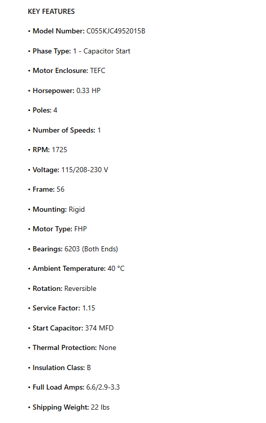 • Horsepower: 0.33 HP