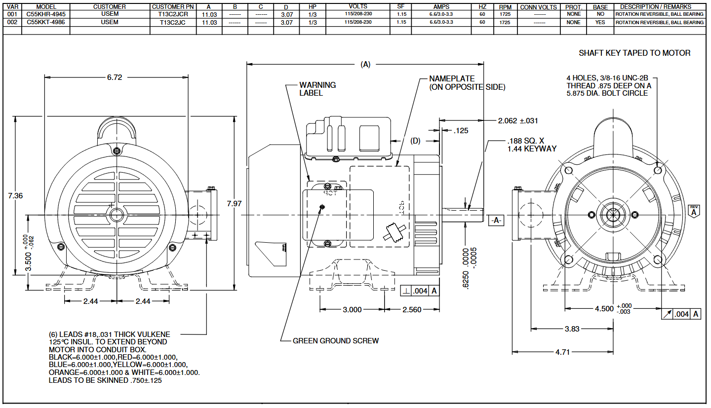 T13C2JC, General Purpose, 1/3Hp, 1725 RPM, 115/208-230V, 1PH, 60Hz, TEFC, Fr. 56C, C055KKT4986015B