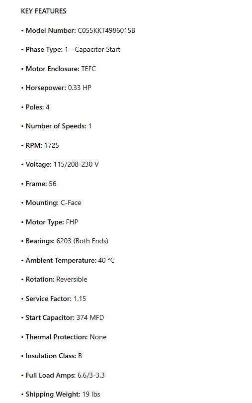 T13C2JC, General Purpose, 1/3Hp, 1725 RPM, 115/208-230V, 1PH, 60Hz, TEFC, Fr. 56C, C055KKT4986015B est en rupture de stock et sera expédié dès qu’il sera de retour en stock.