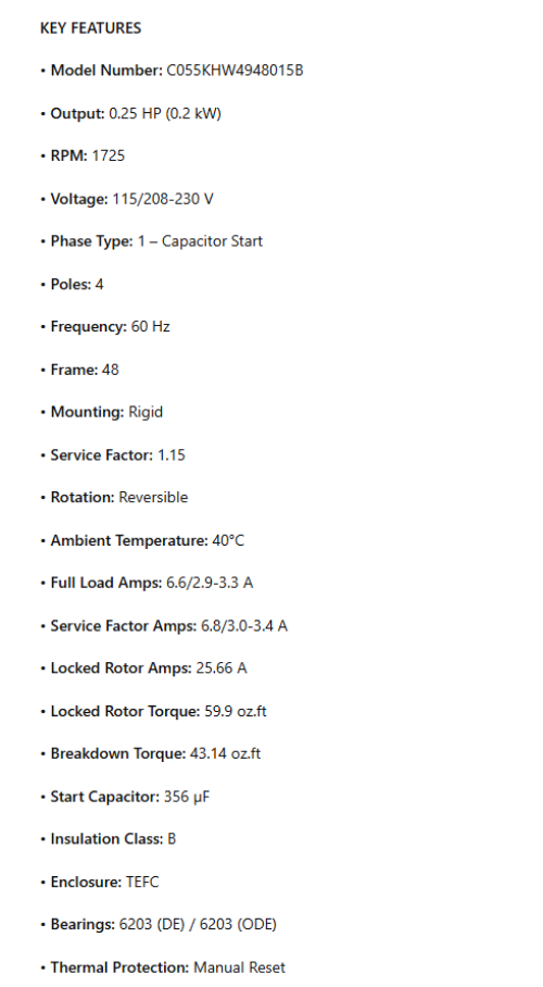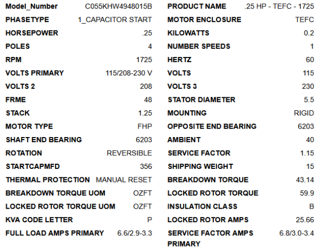 • Service Factor Amps: 6.8/3.0-3.4 A