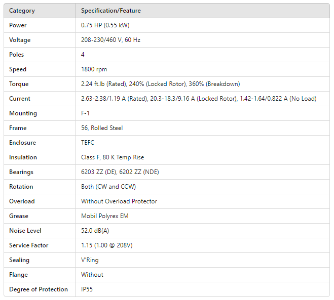 Torque 2.24 ft.lb (Rated), 240% (Locked Rotor), 360% (Breakdown)