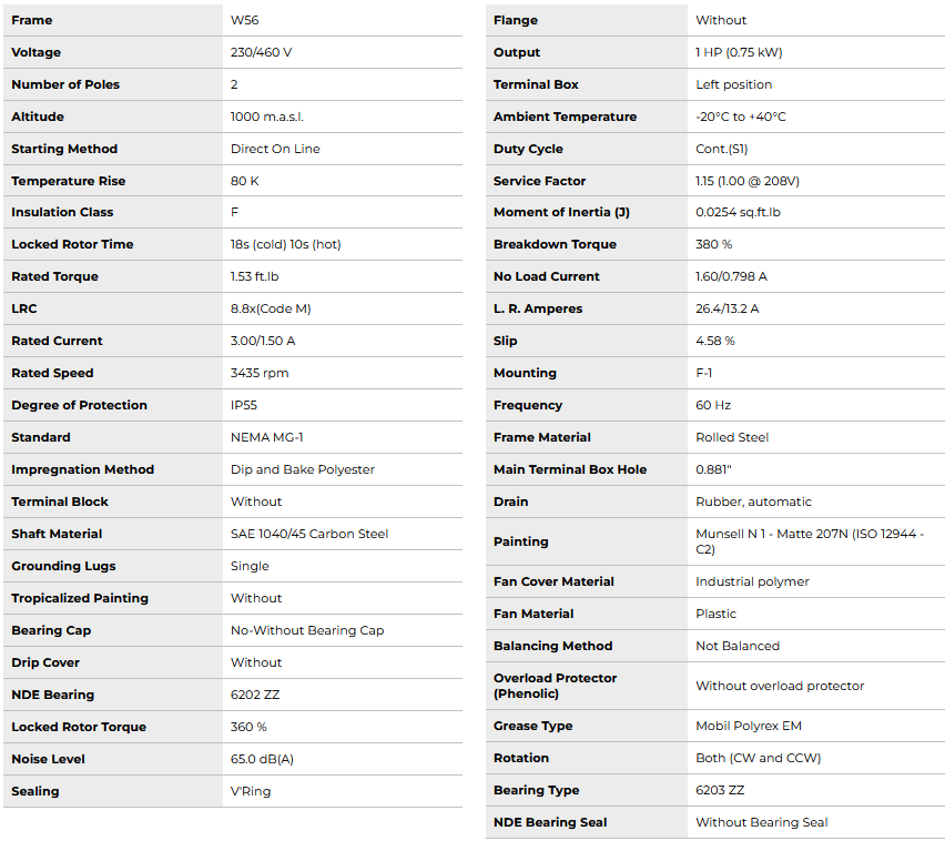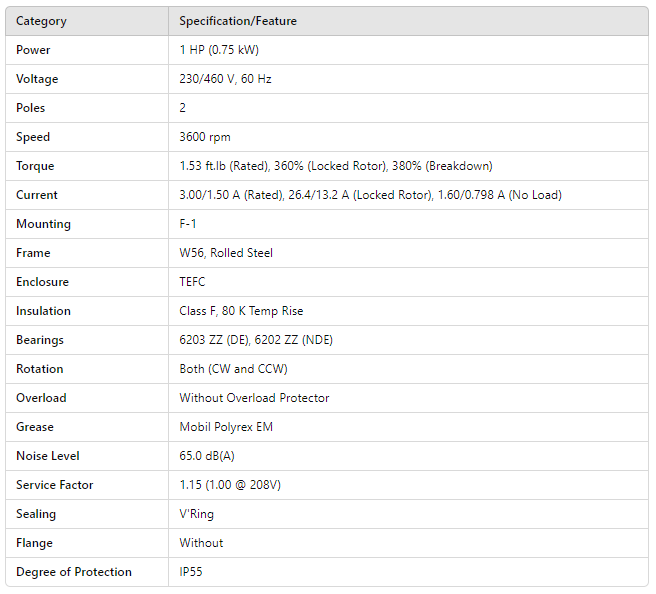 TF000402W01DOE, Rolled Steel Premium Efficiency 1Hp 3435 Rpm 2P W56 3Ph 230/460//190-220/380-415 V 60 Hz IC411 - TEFC - Foot-mounted