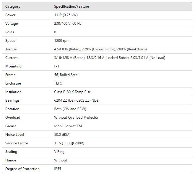 TF000406W01DOE, Rolled Steel Premium Efficiency 1Hp 1145 Rpm 6P 56 3Ph 230/460//190-220/380-415 V 60 Hz IC411 - TEFC - Foot-mounted est en rupture de stock et sera expédié dès qu’il sera de retour en stock.