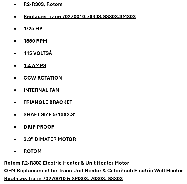 R2-R303, 1/25 HP, 1550 RPM, 115V, 1.4 AMPS, CCW, ROTOM, Replaces Trane 70270010 & SM303, 76303, SS303