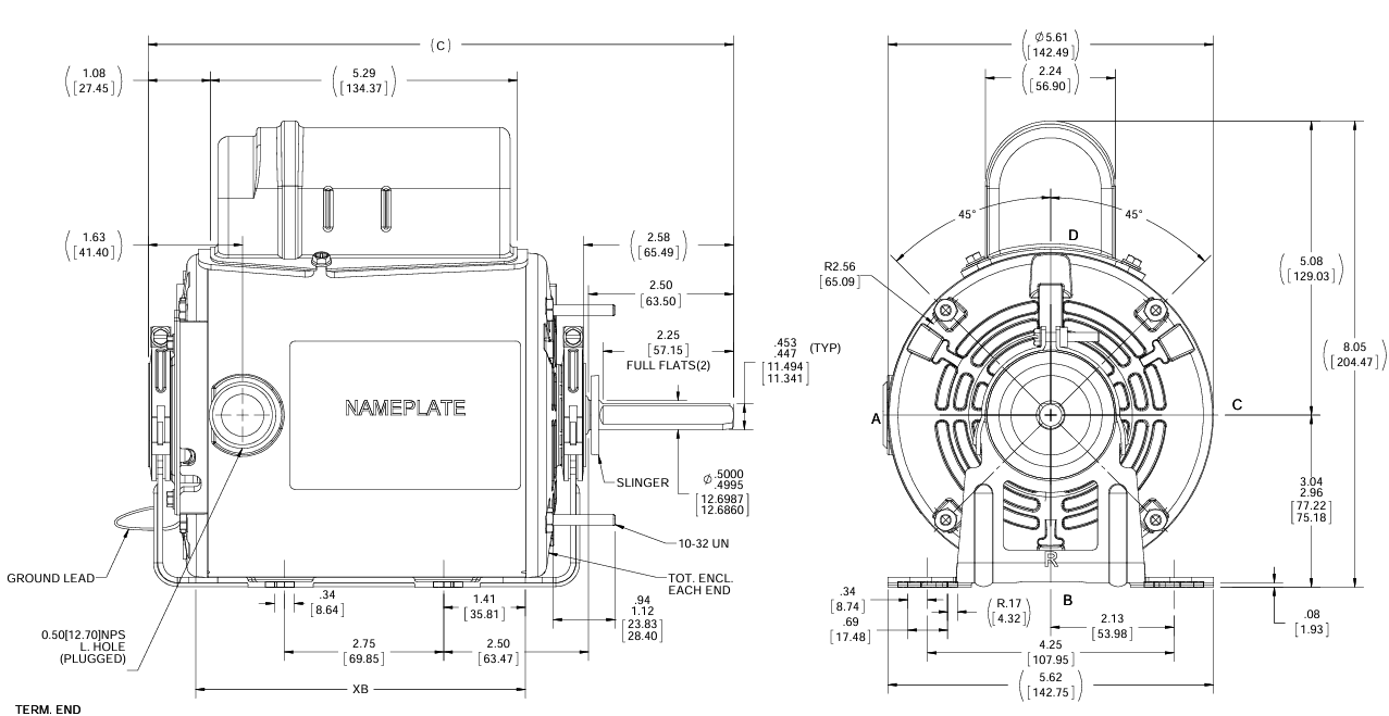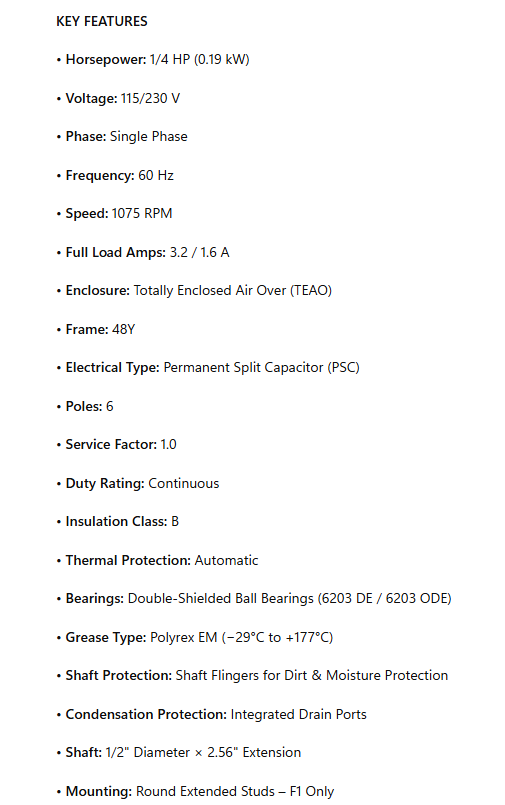 X027, General Purpose Farm Duty Motor, 0.25Hp, 1 Ph, 60 Hz, 115/230 V, 1075 RPM, 48Y Frame, TEAO, 048A11T2021