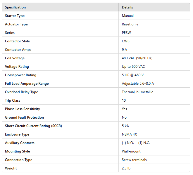 PESW-B9D39EX-R62, Enclosed Starter, 5Hp@460, 480 V Coil with Stop-Reset Pushbuttons - Three Phase, 14655502 est en rupture de stock et sera expédié dès qu’il sera de retour en stock.