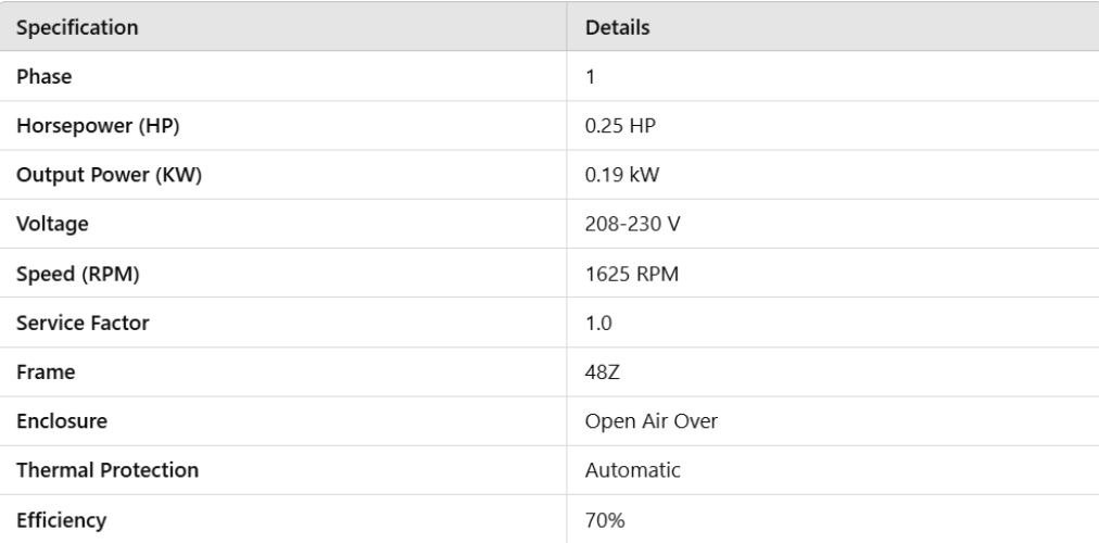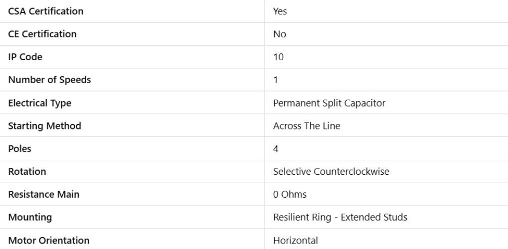 • Permanent Split Capacitor (PSC); Capacitor Required: 5 Mfd-370 Volts (Not Supplied with Motor)