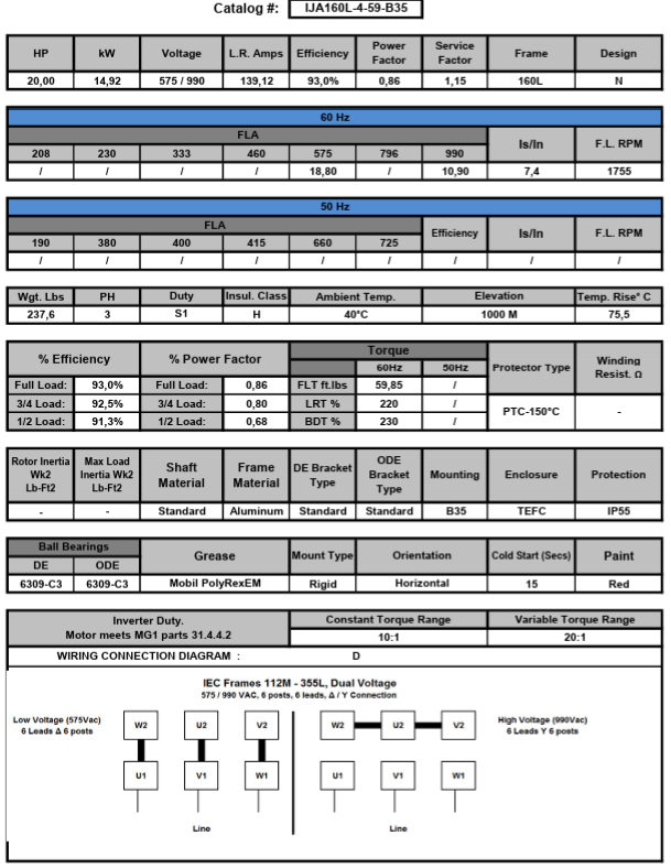 IJA160L-4-59-B35, 20Hp, 1755 RPM , 575/990V, 3Ph, TEFC, Frame 160L IMB35, IP55 est en rupture de stock et sera expédié dès qu’il sera de retour en stock.