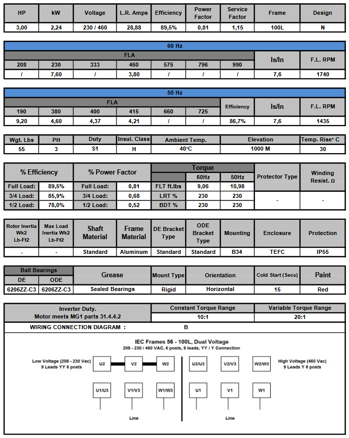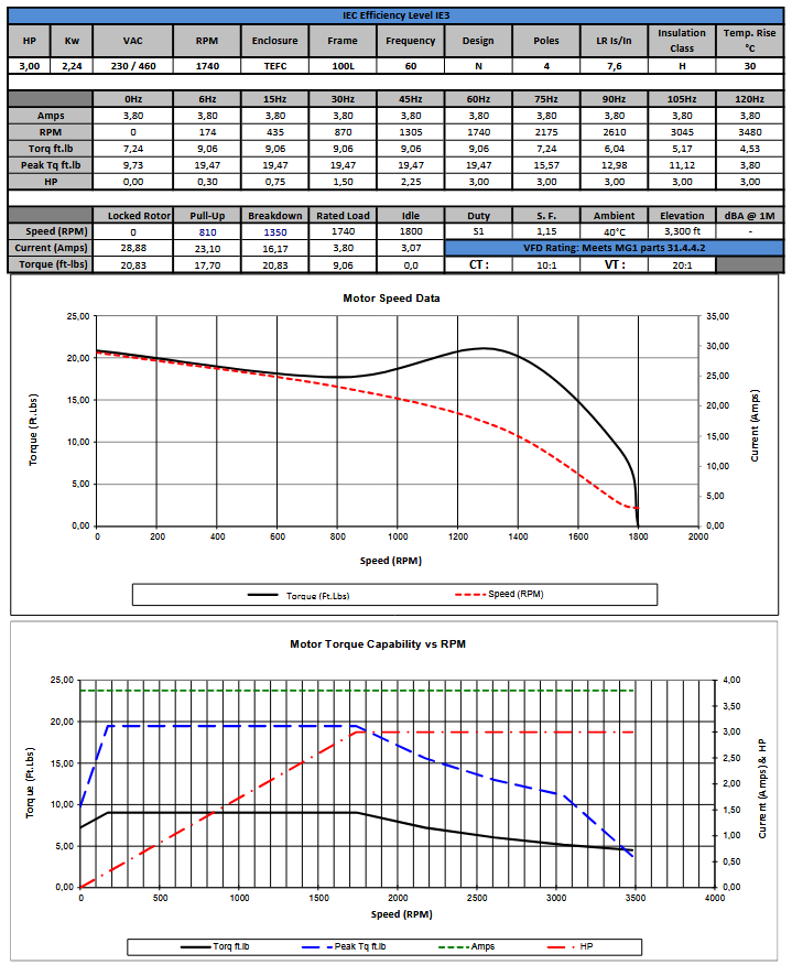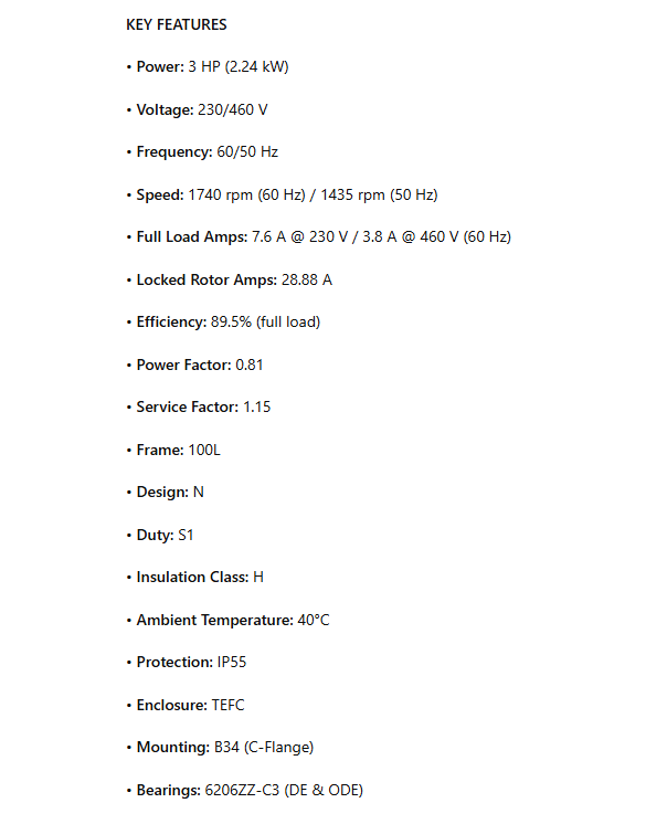 • Full Load Amps: 7.6 A @ 230 V / 3.8 A @ 460 V (60 Hz)
