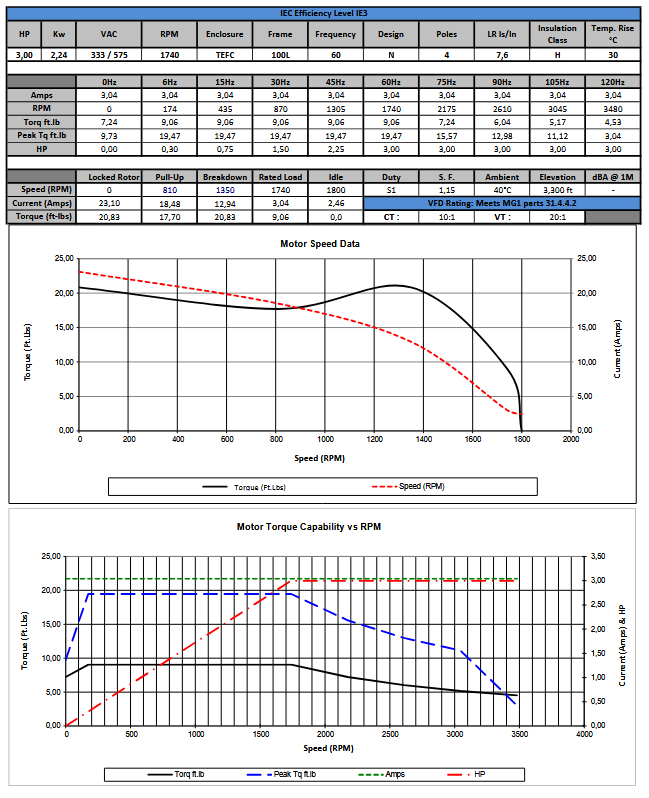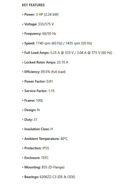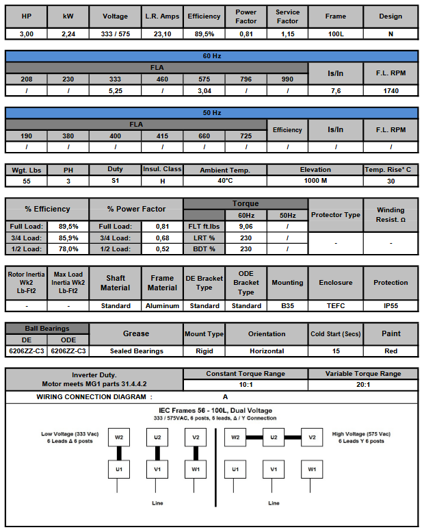 • Full Load Amps: 5.25 A @ 333 V / 3.04 A @ 575 V (60 Hz)