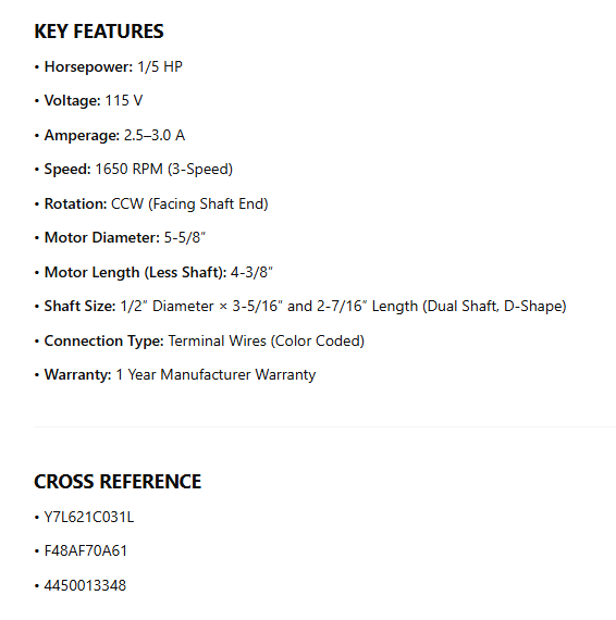 3315332.005, OEM Replacement , 1/5Hp, 115V, 1650 RPM, CCWSE est en rupture de stock et sera expédié dès qu’il sera de retour en stock.