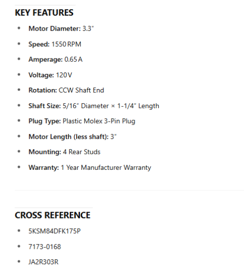 99-08-0450, OEM Replacement , 120V, 1550 RPM, CCWSE, 3.3″ est en rupture de stock et sera expédié dès qu’il sera de retour en stock.