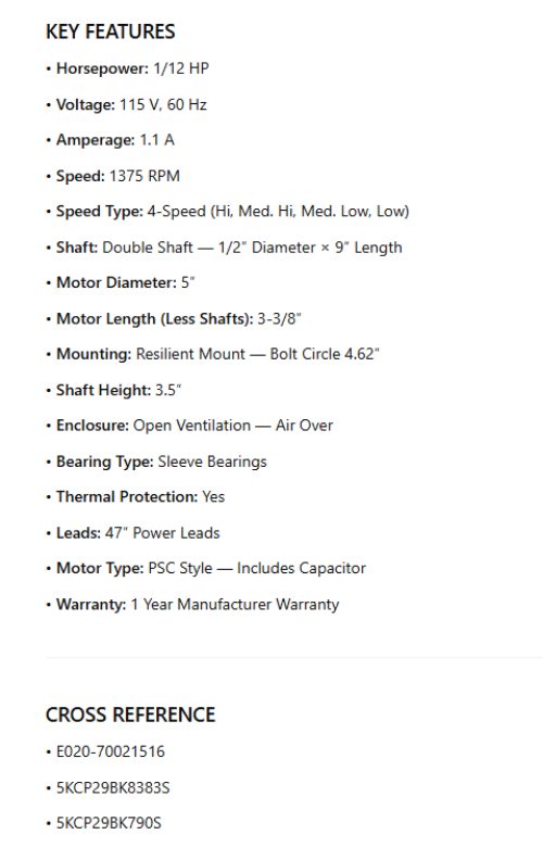 • Motor Type: PSC Style — Includes Capacitor