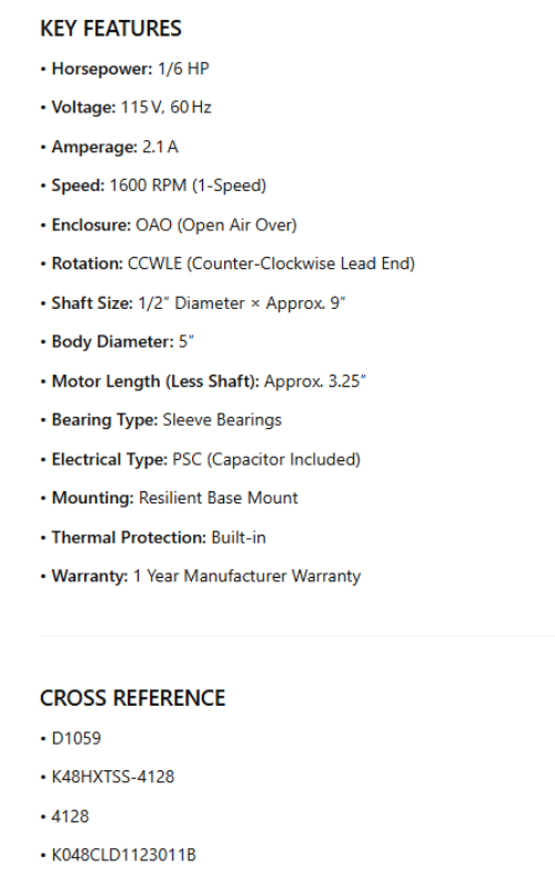 D1059P, OEM Replacement, 1/6Hp, 1600 RPM, 115V, 5.0″ Dia., OAO, CCWLE