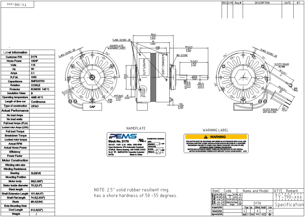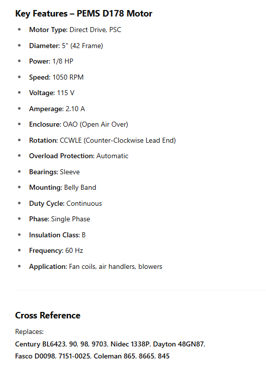 D178, PEMS Direct Drive Motor - PSC - 5" Dia - 1/8Hp - 1050 RPM - 115 V