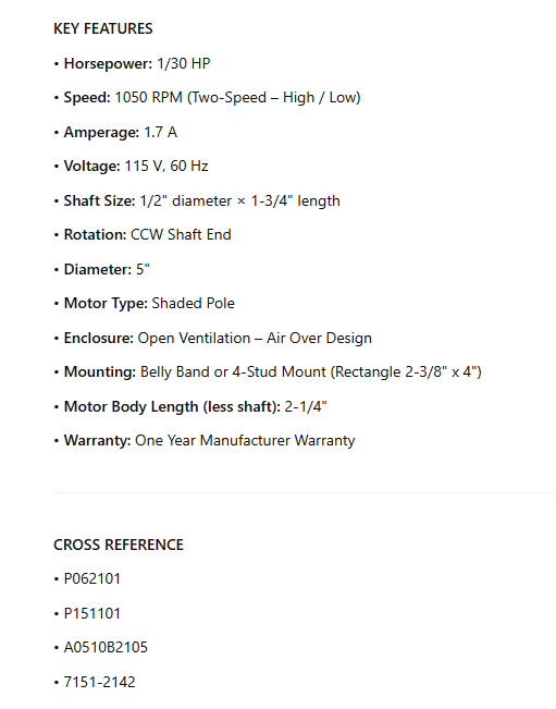 P4086, OEM Replacement, 1/30Hp, 1050 Rpm, 115 V, 60 Hz, CCWSE, 5" Dia.
