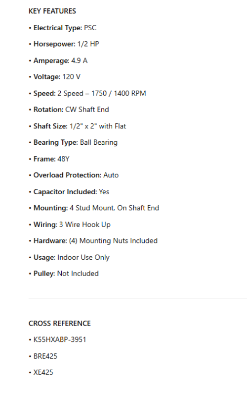 XE425N, OEM Replacement, 1/2Hp, 120V, 1750 / 1400 RPM, Fr. 48Y, CWSE