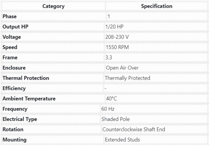 Phase: | 1 | Output HP: | 1/20 Hp |