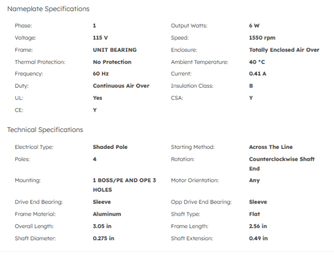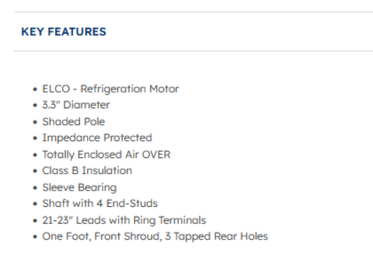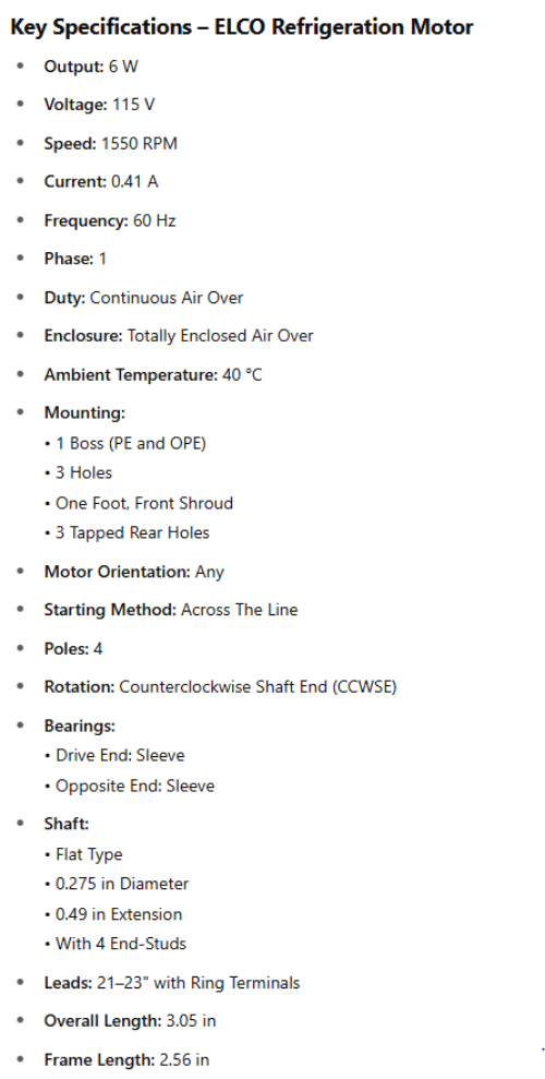 Key Specifications – ELCO Refrigeration Motor
