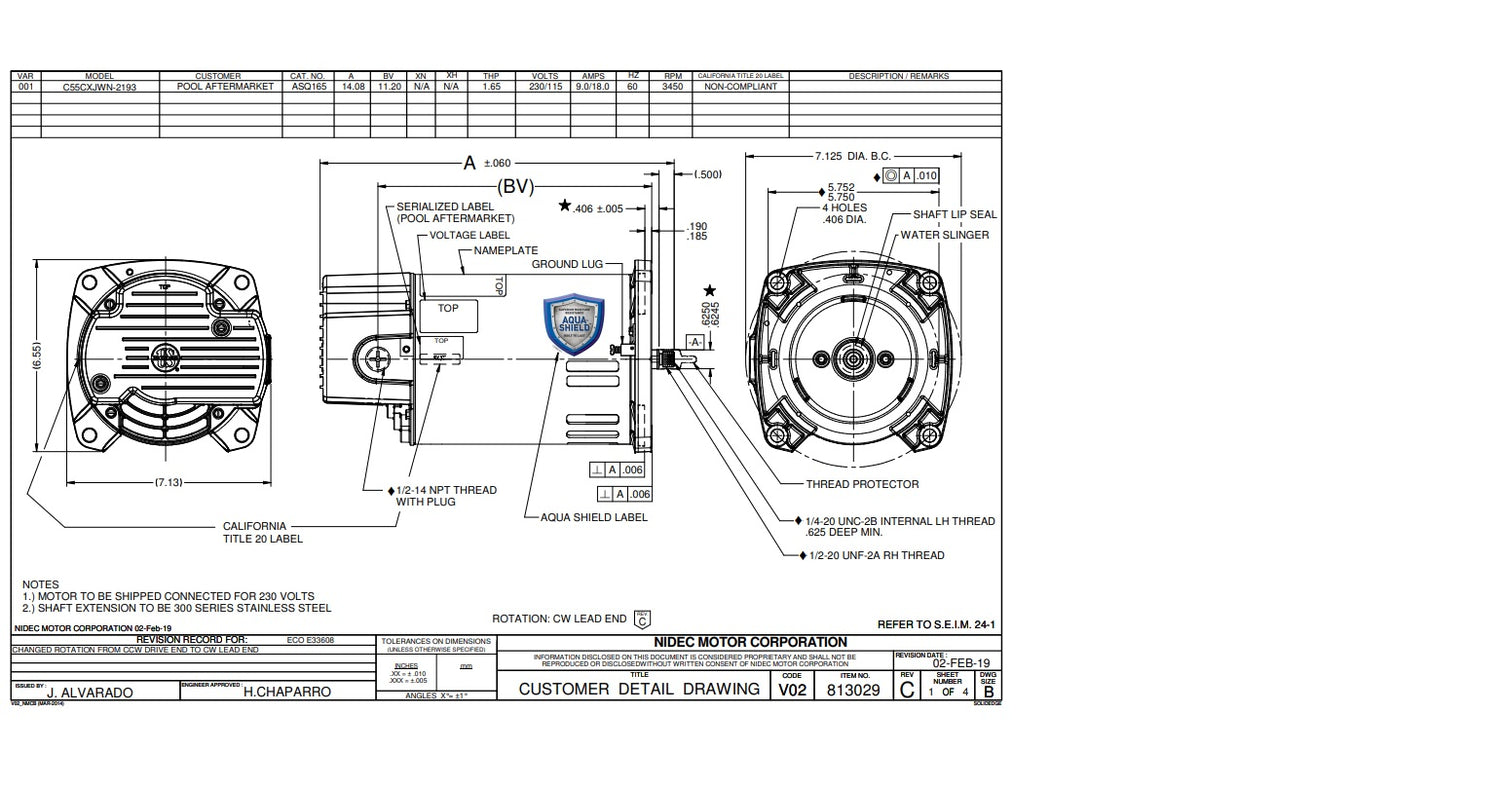 ASQ165, Nidec, 1.65 Hp, 3450 Rpm, 230/115V, Fr: 56J, C055JWN2193013J,