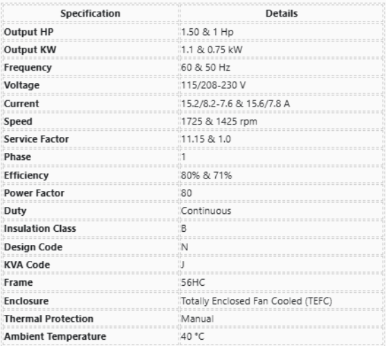 Output HP | 1.50 & 1 Hp |