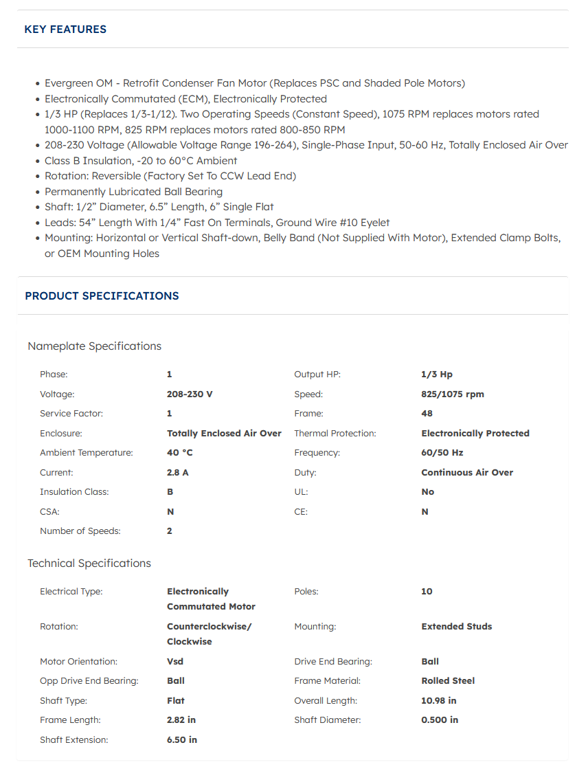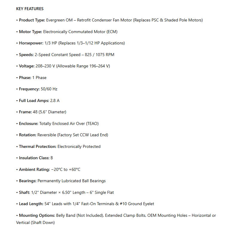 • Product Type: Evergreen OM – Retrofit Condenser Fan Motor (Replaces PSC & Shaded Pole Motors)