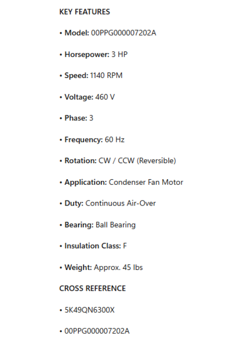 00PPG000007202A, Condenser Fan Motor, 3Hp, 1140 RPM, 460V, 3Ph, 60Hz, CW/CWW