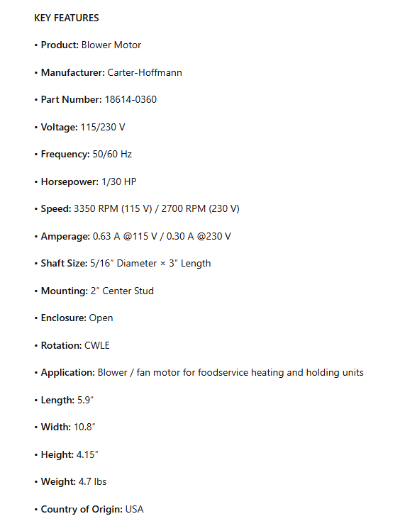 18614-0360 , OEM Blower Motor, 1/30Hp, 3350/2700RPM, 115/230V, 50-60Hz, CWLE, Open Enclosure est en rupture de stock et sera expédié dès qu’il sera de retour en stock.
