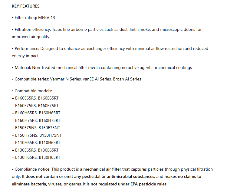 24285, MERV 13 Filter for Air Exchanger