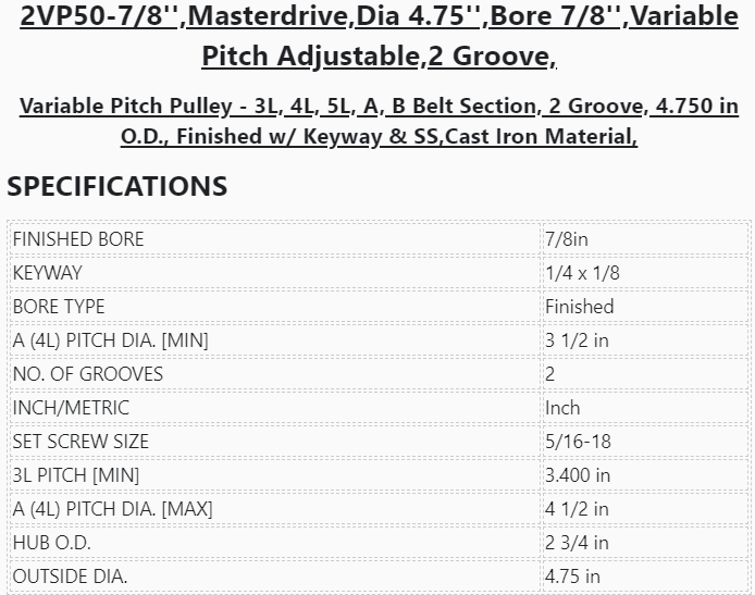 2VP50-7/8'',Masterdrive ,Dia 4.75'',Bore 7/8'' ,Variable Pitch Adjustable ,2 Grooves