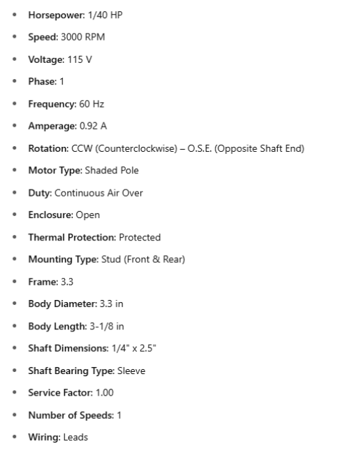 JA1N625N, Magnetek, 1/40Hp, 3000 Rpm, 115 Volts, Frame: 3.3, OAO,