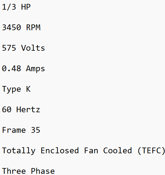 3J133FA6, General Electric, 1/3Hp, 3450 Rpm, 575 Volts, Frame:35, Tefc,