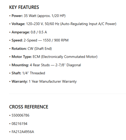 4275M, PEMS OEM Replacement - Cold Zone , 1/20Hp, 1550 / 900 RPM, 120-230V, CW