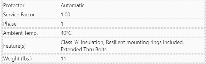 Feature(s) | Class 'A' Insulation, Resilient mounting rings included, Extended Thru Bolts |