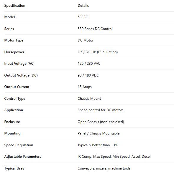 533BC, 530 SERIES DC CONTROL 1.5/3.0Hp 120/230VAC ~ 90/180VDC 15AMP CHASSIS