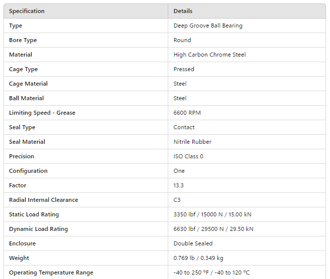 Static Load Rating | 3350 lbf / 15000 N / 15.00 kN |