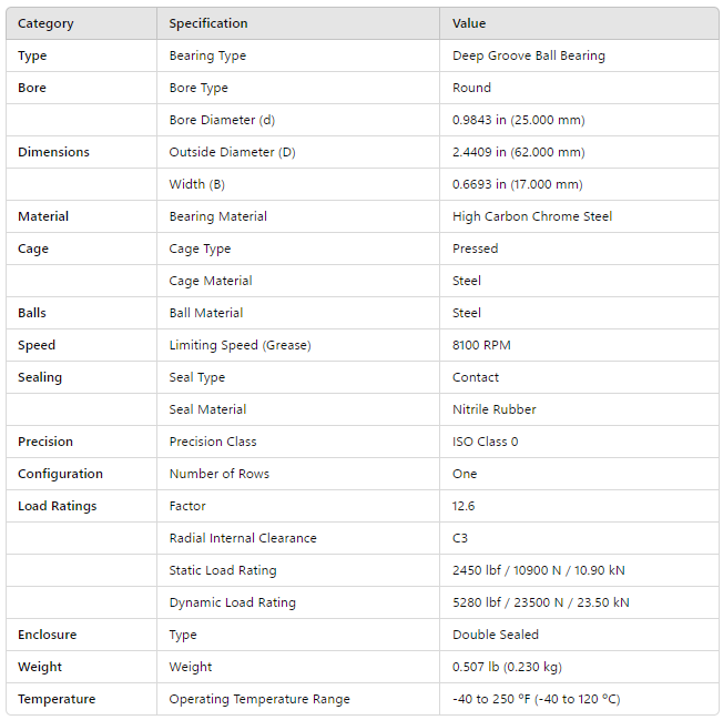 Bore Diameter (d) 0.9843 in (25.000 mm)