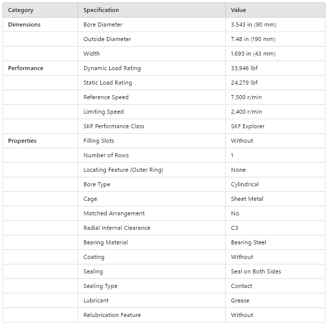 6318-2RSH-C3, Rubber Sealed Deep Groove Ball Bearing 90x190x43mm