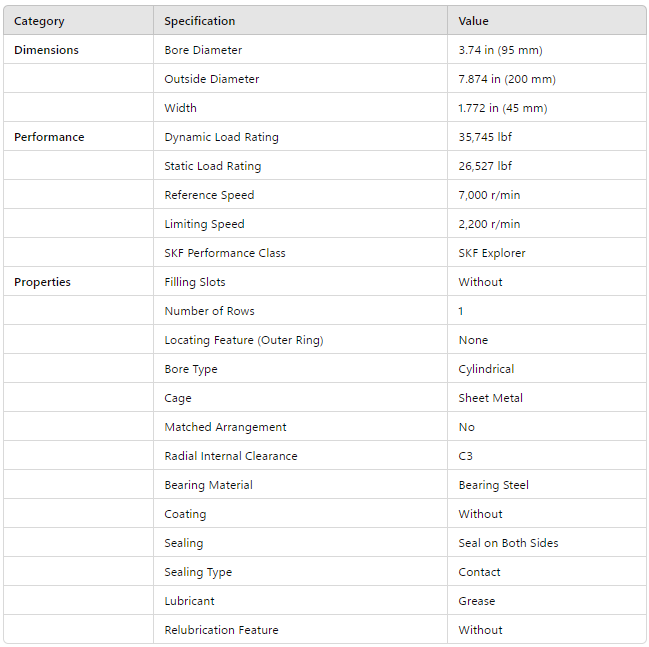 6319-2RSH-C3, Rubber Sealed Deep Groove Ball Bearing 95x200x45mm