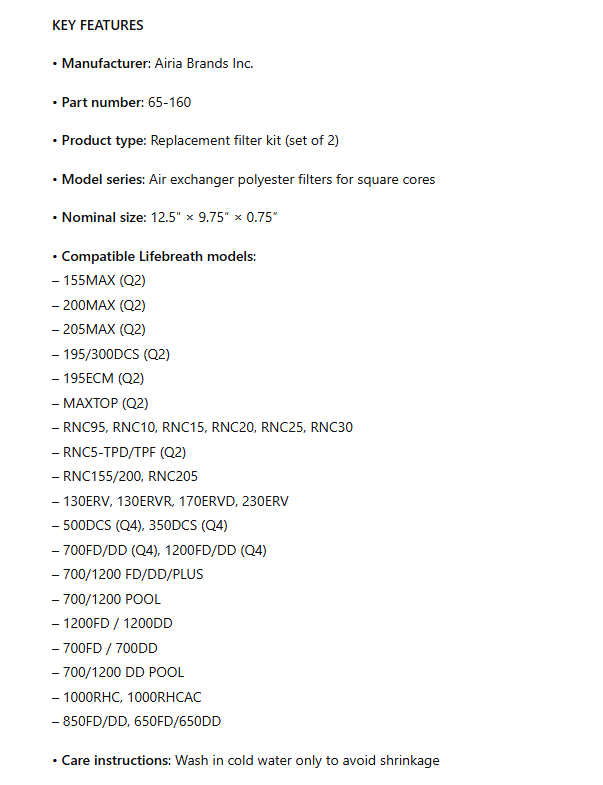 65160, Lifebreath Polyester Merv-6 filters, RNC5 / RNC155 / RNC205