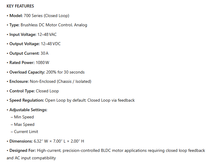 • Designed For: High-current, precision-controlled BLDC motor applications requiring closed loop feedback and AC input compatibility