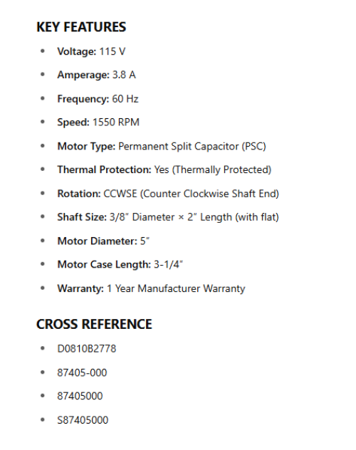 87405, OEM Replacement, 115V, 1550 RPM, CCWSE