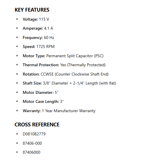 87406, OEM Replacement, 115V, 1725 RPM, CCWSE