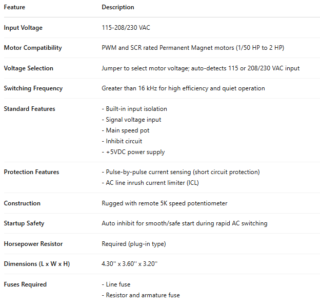 Motor Compatibility PWM and SCR rated Permanent Magnet motors (1/50 HP to 2 HP)