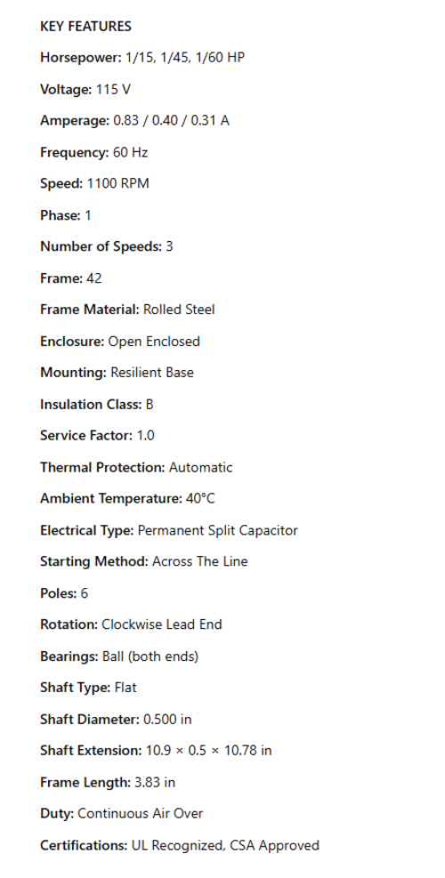 953A, OEM Replacement Motor, 1/15,1/45,1/60Hp, 1 Ph, 60 Hz, 115 V, 1100 RPM, 3 Speed, 42 Frame, OPEN