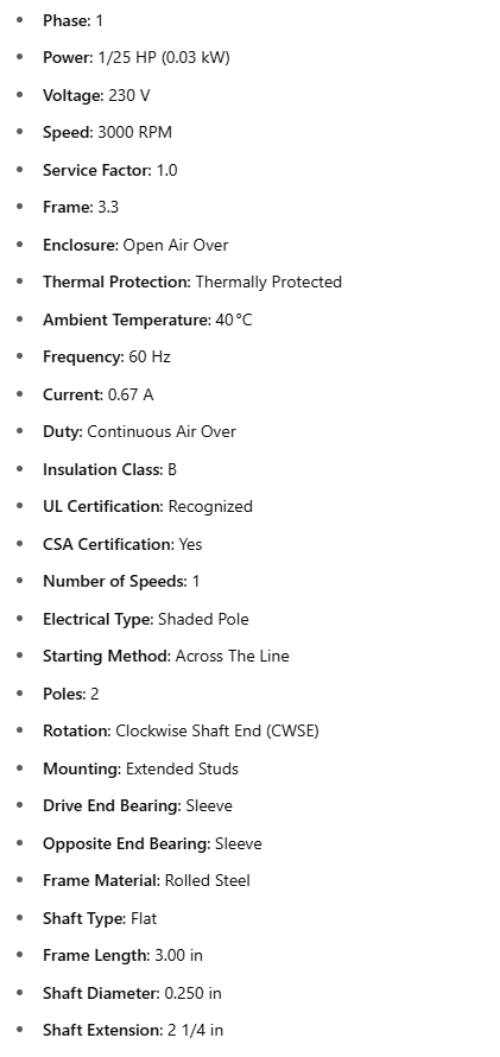 JA1P105N, Magnetek, 1/25Hp, 3000 Rpm, 230 Volts, Frame:3.3, OAO,