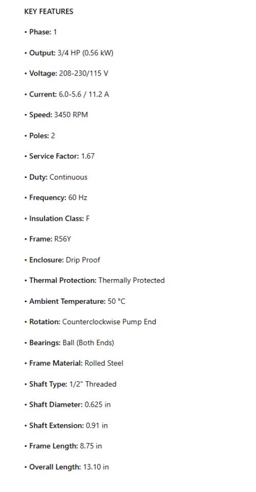 B2661, Pool Pump Motor, 3/4Hp, 1 Ph, 60 Hz, 208-230/115 V, 3450 RPM, R56Y Frame, DP